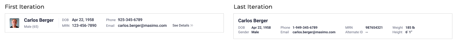 I explored multiple design concepts for the patient profile and iterated several times before we ultimately moved forward with the latest version. While the earlier iterations were visually appealing, they didn’t align with real-world usage. For example, patients rarely upload profile photos through the mobile app, making prominent photo placement unnecessary. Additionally, since some patient names can be quite long, dedicating a full row to the name improved readability and layout flexibility.